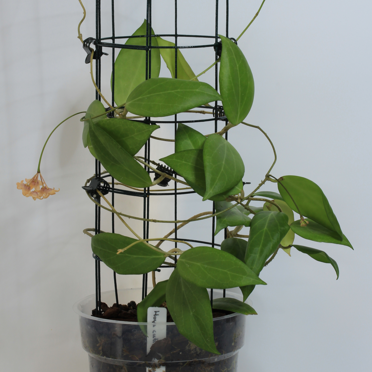 Hoya cutis-porcelana (RJ-1) är en trevlig, medelstor hoya. Bladen är gröna med ljusare nerver och har en fin glans om plantan mår bra. De är ganska jämna och avslutas i en spets. Ny blad blir fint bronsfärgade. Blommorna finns i lite olika färgkombinationer av persika och rosa där bikronan är rosa och drar mot vinrött och nästan svart i mitten. Blommorna är längre än vad hoyablommor vanligtvis är och knopparna är ovala när de öppnas och inte platta. Kronan öppnar sig bara längs hälften av knoppen och rullar bara tillbaka spetsarna halvvägs vilket ger blomman ett säreget utseende i hoyavärlden. Blommorna håller i 4-5 dagar. Doften är god, jag tycker den luktar godis vilket förmodligen betyder någon sorts onämnbar fruktgodis. Det är en klättrande hoya men den klättar inte så effektivt så en ampel hade förmodligen fungerat bra med. Den här klonen avviker lite från den klon som stod som modell för publiceringen. Skillnaden är att denna klonens kronas spetsar är kortare och ser ut att ligga mer inbäddad i bikronan.
