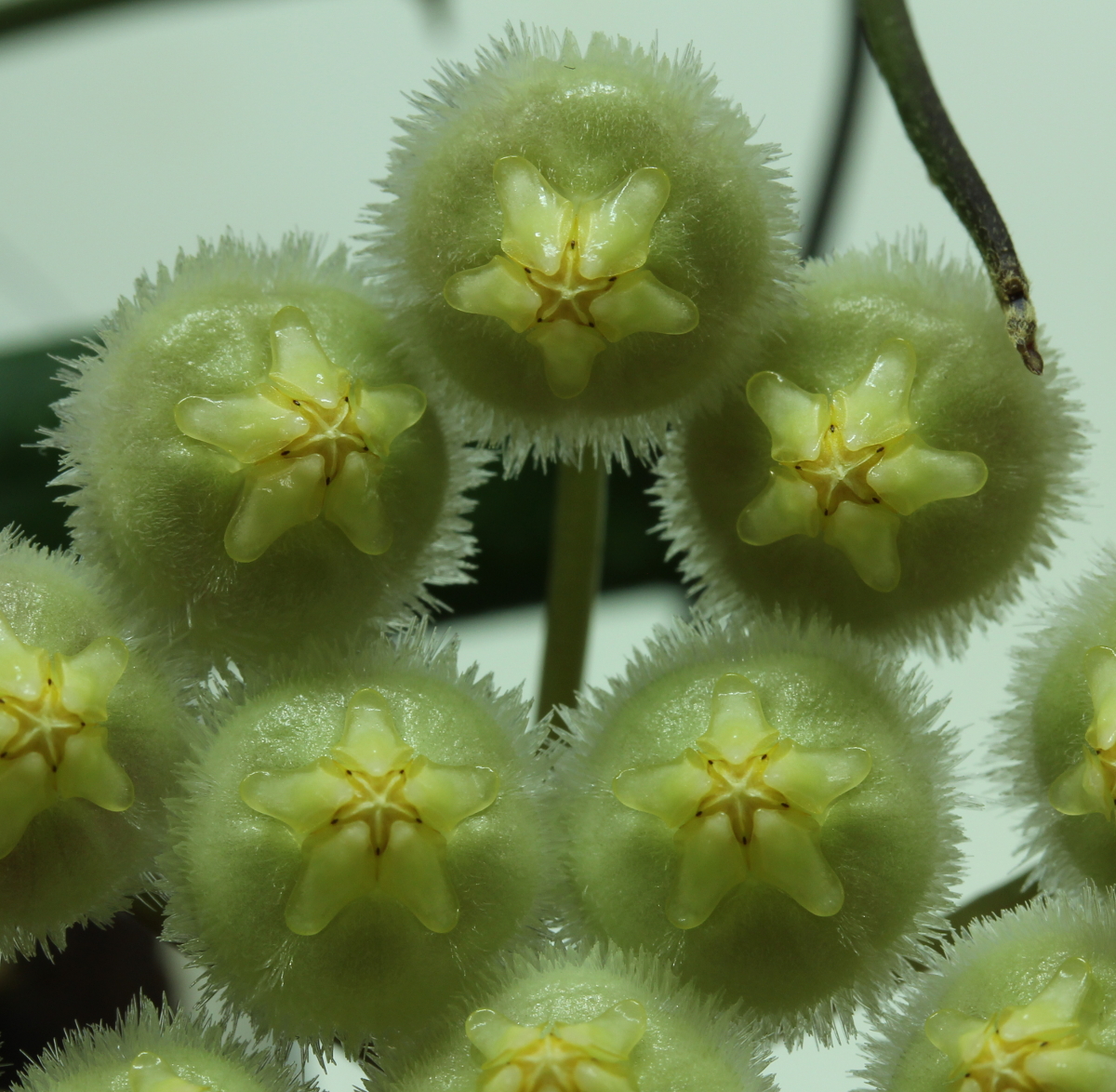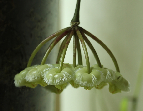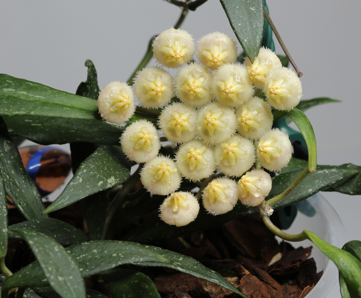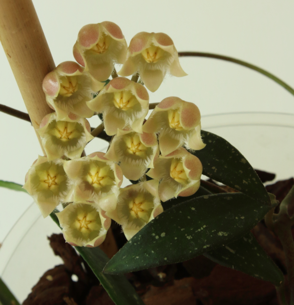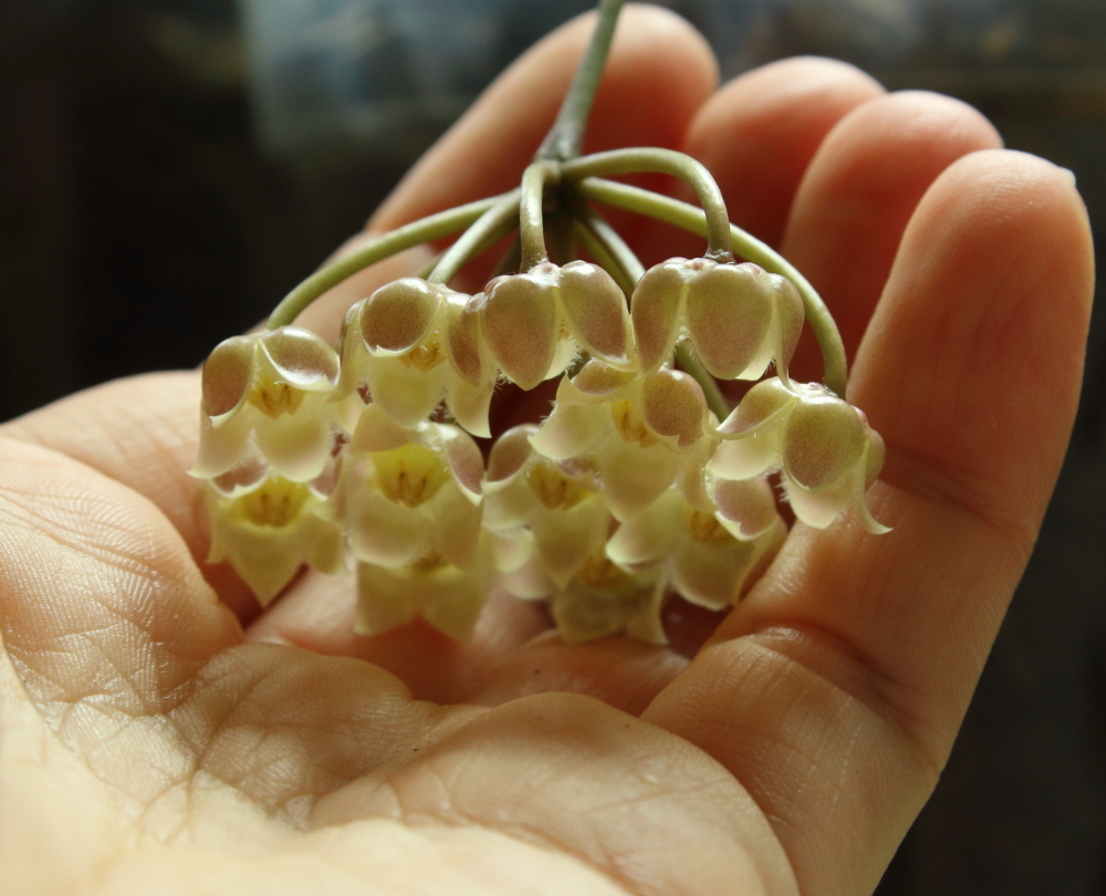 Hoya mirabilis har i mina ögon vackra blad som är långa, smala, mörkgröna med ordentligt med silverfläckar. Blommorna öppnar sig långsamt och är nästan vackrast de första dagarna innan de rullar bakåt. Egentligen ska de vara gröna och gula men hos mig har blommorna blivit svagt gröna med gul mitt bara de allra första dagarna innan de snarare blir cremerosa med gul mitt. De droppar en del nektar så klappas blommorna blir det lite kletigt. Den första dagen luktade den lite marsipanaktigt och gott, för att sedan övergå till något acetonliknande som inte var lika behagligt. De sista dagarna luktade den gräs.