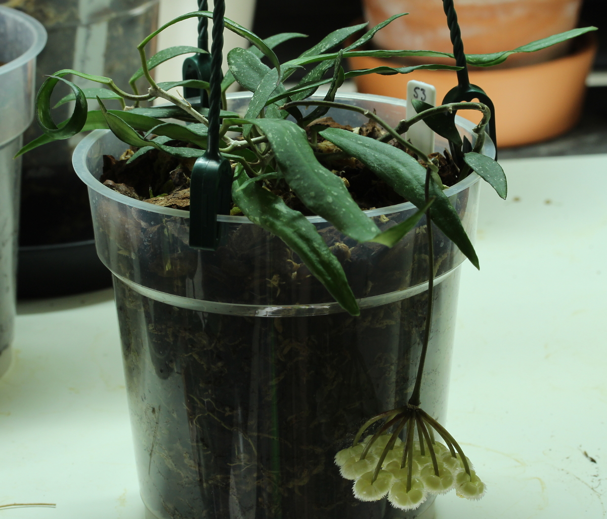 Min Hoya mirabilis köpte jag i april 2017. Den går under smeknamnet trasselsudden. Sticklingen jag köpte hade växt ganska rörigt och härhemma blir dessutom bladen ungefär en tredjedel så stora som de ursprungliga var. Inte för att den växer mycket. Istället kastar den ut blomställningsskaft åt höger och vänster varav de flesta dör in då växten uppenbarligen är för liten och svag för att underhålla så många skaft. Intrycket blir en oerhört rörig växt. Den blommade för första gången i juli 2017. Just nu växer mirabilis på trasselsuddvis, men jag planerar att använda ett stöd i framtiden då blommorna inte riktigt kommer till sin rätt annars.